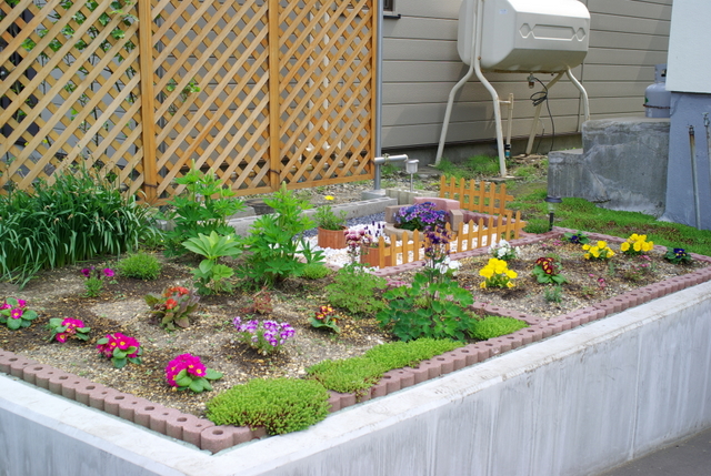 煉瓦製暗渠を植え込みプランターとして利用しています。近所の米沢煉瓦工場にダメ元で頼んでみたら、快く売ってくれました。野幌はレンガ製造の街がアィデンティティなので、どうしてもレンガを取り入れたかったのです。