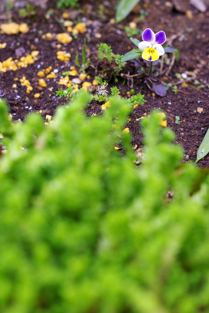 たぶん、去年植えていた一年草のパンジーの種がここに落ちて咲いたのでしょう。