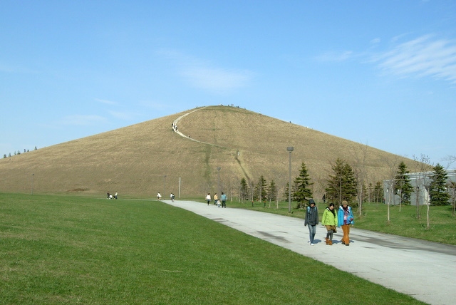 貴重な丘珠発着便を2便も見ることが出来て満足しながら下山しました。今日は寄り道ついでの訪問だったので公園全体を回ることが出来ませんでしたが、それは次回のお楽しみにとっておこうと思います。野幌の4番通りからも見える人工山は見晴らしが良く満足しました。公園の雰囲気は敷地が広大なせいもあってか、全体としてやや硬いかな~という印象でした。延々と続く石畳の道を、やや疲れ気味の身体を前へ押しながら歩くのは少々しんどい感じです。途中に休憩できるベンチや東屋なんかがあれば良いのですが、イサムノグチ氏のコンセプトに反するためか、そういった施設は一切見当たらず、老人や体力のない病人には向かない公園かもしれません。
