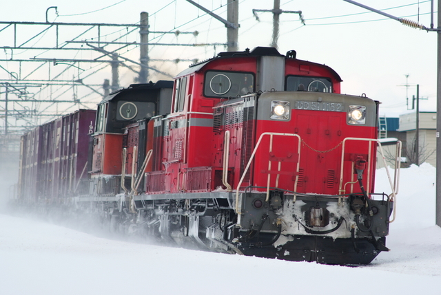 これまで、原色重連にはひたすらフラれ続けているので多分この先もめぐり合うことはまず無いでしょう。それにこだわるよりも、DD51重連を撮影できる限られた機会を楽しむことに集中したいものです。今日のアングルはなかなか気に入ったので、体調と光線状態の良い日を選んでリトライしようと思っています。