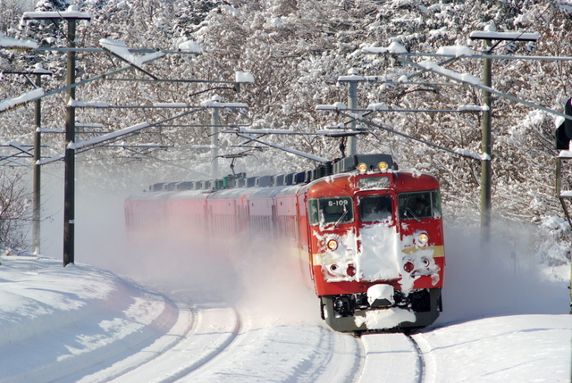 狙いは写真の通り、雪景色の中を行く711系です。ちょっと色気を出して、木々の樹氷のような着雪を大きく取り入れてみました。