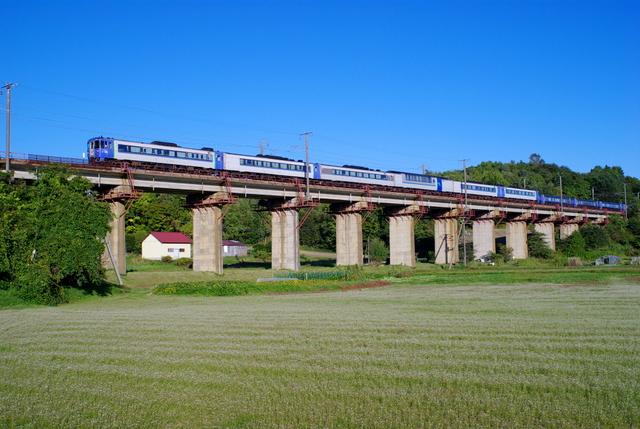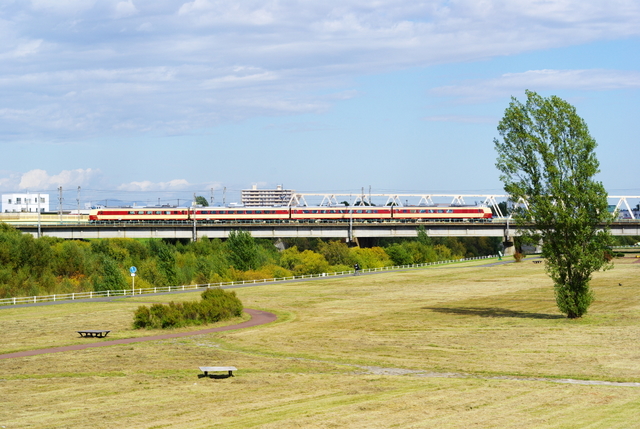 そして今日、札幌付近を昼過ぎに通過する「おおぞら」を撮りに豊平川に行きました。最初は逆光覚悟で橋梁手前のS字カーブで構えていたのですが、秋の日差しが予想以上に強烈で、急遽、河川敷からサイドを狙うことにしました。